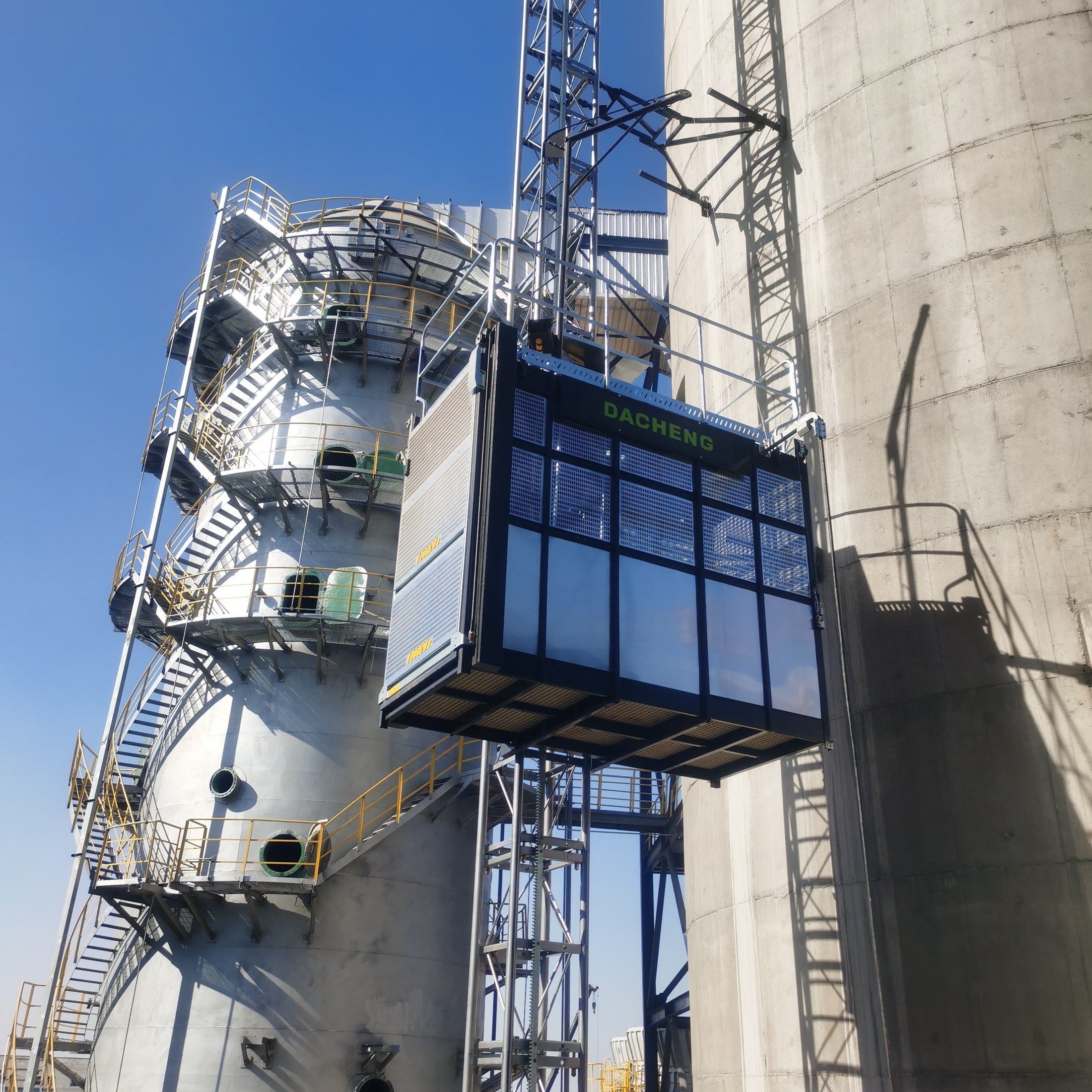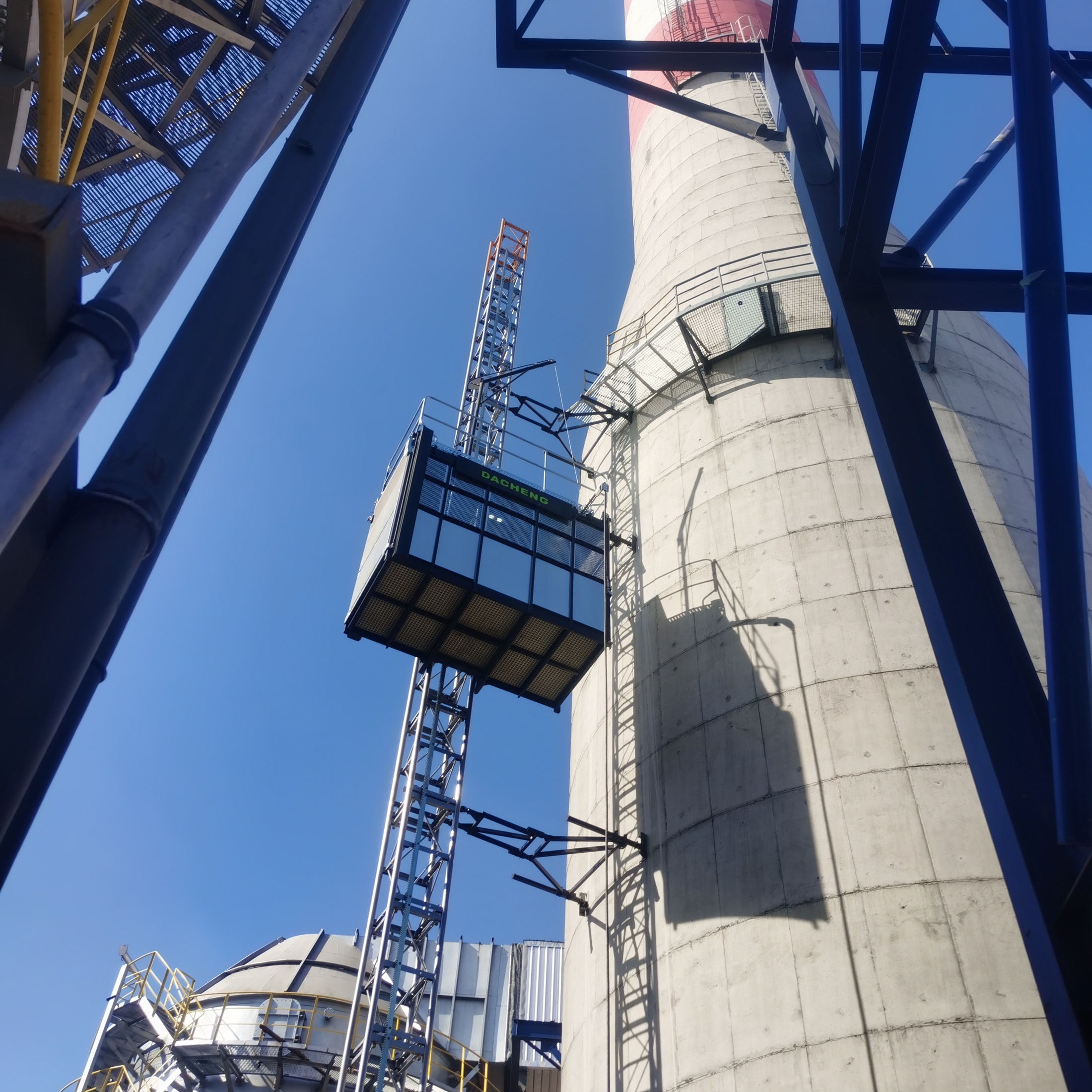 烟囱工业升降机是专为环保检测人员和烟囱维修人员及运送小型物料而设计的升降机,主要用在火力发电、热能、化工、冶炼等场所。